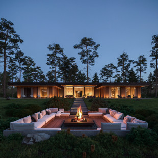 Этот загородный дом – часть просторной усадьбы для большой семьи. Её владельцы объединили два соседних участка с уже готовыми домами из бруса, один из которых дополнили спа-зоной. Помимо спа на первом этаже находится единое общественное пространство гостиной, столовой и кухни, а на втором разместились две спальни, санузел и гардеробная.