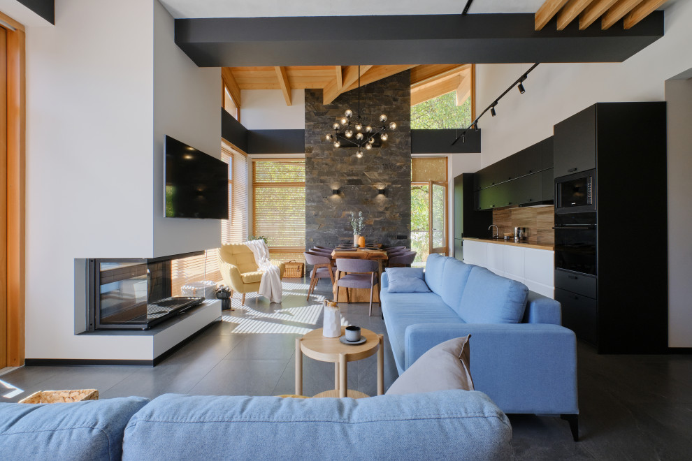 Гостиная, Контемпорари, Шале, балки, дерево, дом, камень, лофт, минимализм, шпон