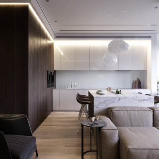Пример оригинального дизайна: прямая кухня-гостиная в современном стиле с белыми фасадами, белым фартуком и белой столешницей