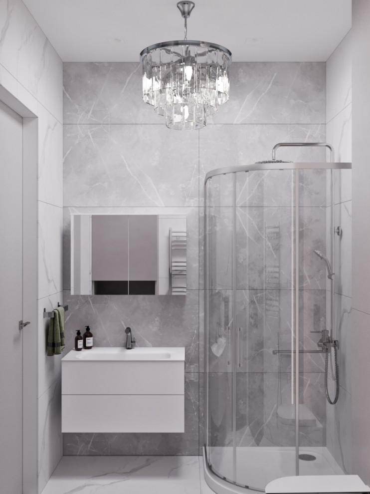 600x1200 мм, Barcelona, Italon, Контемпорари, Россия, Санкт-Петербург, белый мрамор, дверь со скрытой коробкой, дизайн душевой, дизайн квартиры в московском районе, зеркальный шкаф, квартира в современном стиле, керамогранит Imperiale Ret Charme Evo Italon 600x1200 мм, лаконичный интерьер, люстра 9406 model LOFT.DESIGNE, приглушенные цвета в квартире, санузел при спальне, светлый санузел, серый мрамор, стильная квартира