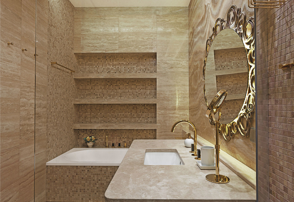 Эклектичный по своему духу городской интерьер площадью 140 кв.м., гармонично сочетающий в себе разнообразную игру света, формы и поверхностей. В рамках этого проекта мы решили немного поэкспериментировать не только с отделочными материалами но и подбором мебели для интерьера. Здесь сочетаются не только предметы с современным дизайном, как например барные табуретки Константина Гржича и стулья для кухни Рэй и Чарльза Имз, но и объекты из нашей собственной коллекции Linea Artistica, которые обычно имеют более классический дизайн с элементами стиля модерн. Всю корпусную мебель, как и для большинства наших проектов, мы спроектировали сами и изготовили на собственном производстве. Поскольку помещение само по себе достаточно светлое, а для темного времени суток нами было подобрано достаточно интересное и эффективное решения, мы не побоялись использовать темные сорта дерева и оформление отдельных стен «под кирпич». Помимо кирпича в интерьере присутствуют также и другие элементы в индустриальном стиле, например стеклянная перегородка с дверью, состоящая из металлической рамы и стекла. Обе ванные комнаты мы сделали светлыми, особенно одну из них, имеющую полукруглую стенку из стеклянных кирпичей.