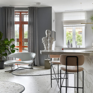 Дизайн-проект Ильи и Светланы Хомяковых. Идея всей квартиры - сделать её достаточно лаконичной, но при этом наполненность и единство деталей должны сохраняться. Простое в сложном. Дизайнеры использовали эффект линий и сложность фактур, сделали упор на архитектуру проекта. Для большего ощущения воздуха и объёма Илья и Светлана создали "градиент" в тонах всего помещения. Самое светлое место - столовая, а самое тёмное - зона тв, многие оттенки уходят в глубокий, практически чёрный, цвет. Почти нет акцентов, цветовым центром всего пространства служит единственная картина в комнате - огромное панно, созданное нами в коллаборации с известным художником. Все столярные изделия, использованные в проекте, сделаны под заказ фабрикой "Планета Дизайна".