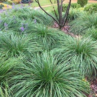 Идея дизайна: огромный солнечный, летний засухоустойчивый сад на склоне в современном стиле с клумбами, хорошей освещенностью, мульчированием и с каменным забором