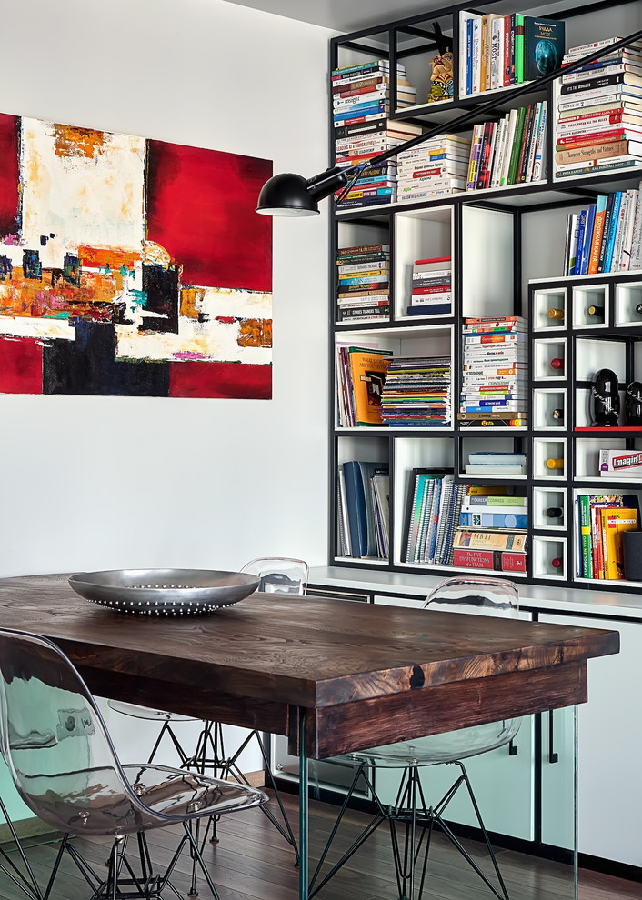 Москва, Столовая, Эклектика, библиотека, деревянная столешница, необычный стол, открытое хранение, стеклянные ножки, хранение книг