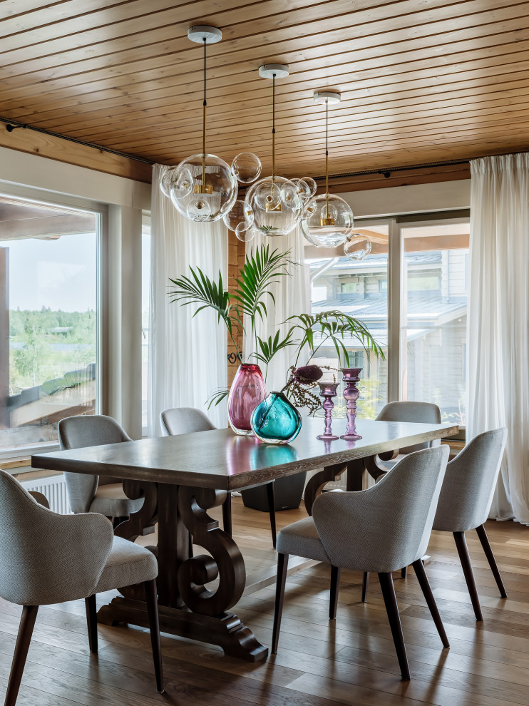 wood house, Контемпорари, Кухня и столовая мебель, Столовая, декор деревянного дома, декор дома, деревянный дом, дизайн деревянного дома, интерьер дома, интерьер столовой, кухонная посуда, люстры, обеденные столы, обеденные стулья, подвесное освещение, стулья, текстиль для штор, товары для кухни, шторы
